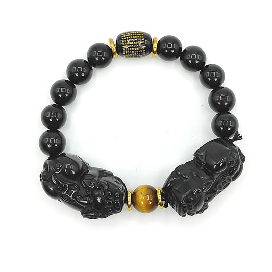 Feng Shui Natural Gold Black Obsidian Double Pi Yao Wealth Bracelet For Men & Women [10mm - Best Seller in USA]