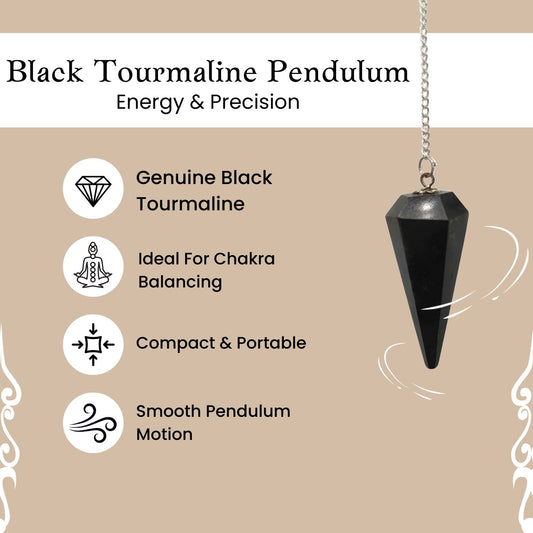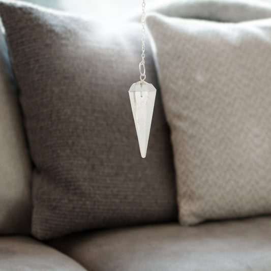 A dowsing pendulum is a weighted object, typically a crystal or small object suspended on a string or chain. It is used for divination and dowsing, which is the practice of using a tool to locate hidden objects or information. The pendulum swings in different ways in response to questions asked by the user, and the movements are interpreted as answers.