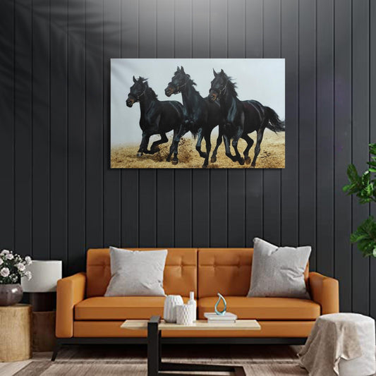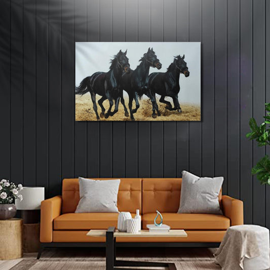 3 Black Running Horses Vastu Feng Shui Canvas Print, Paintings For Office, Home Living Room & Bedroom Decor
