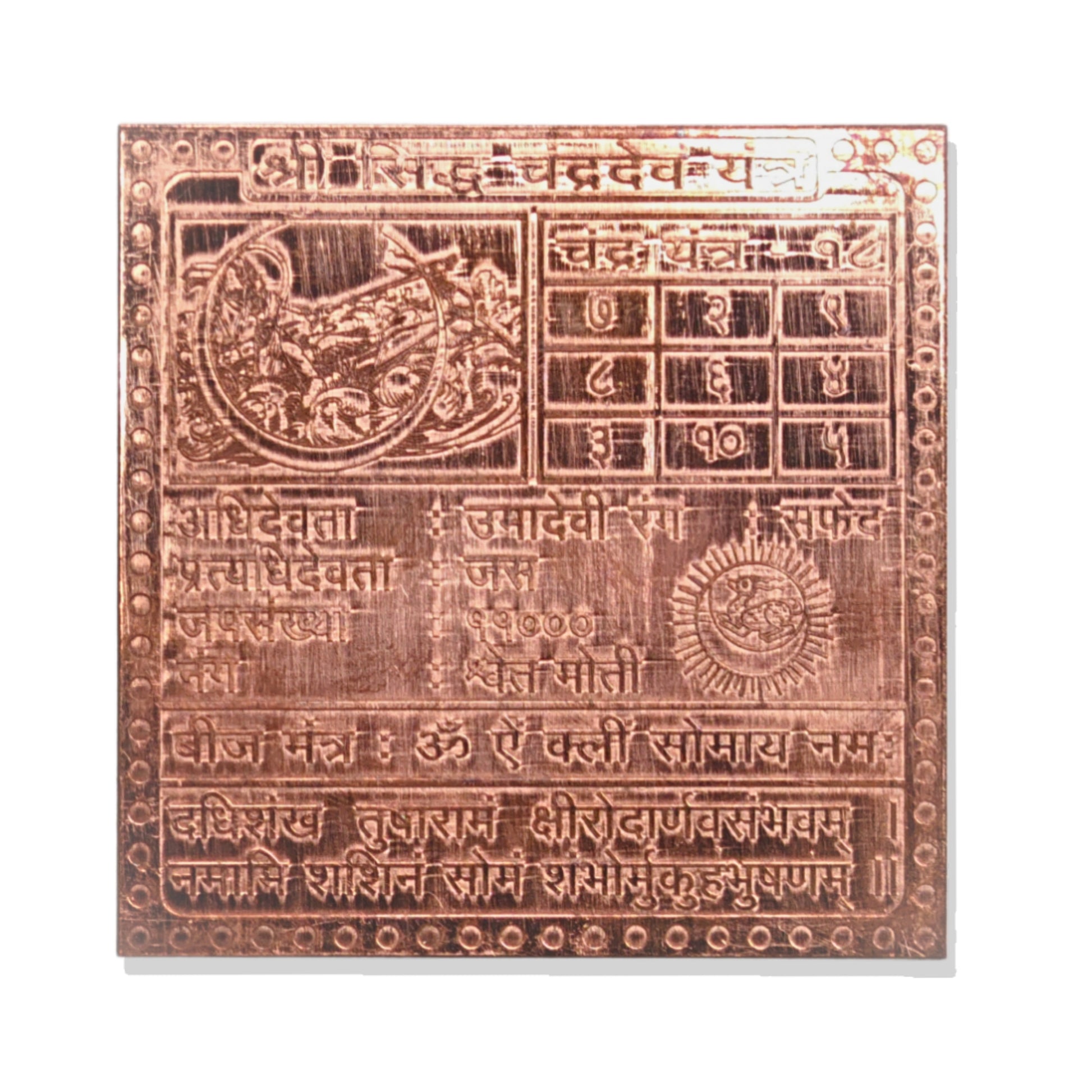 A: The Siddh Chandra Dev Yantra is a sacred yantra dedicated to Lord Chandra (Moon). It is believed to balance emotions, calm the mind, enhance peace, and protect against the malefic effects of Moon in one’s horoscope.